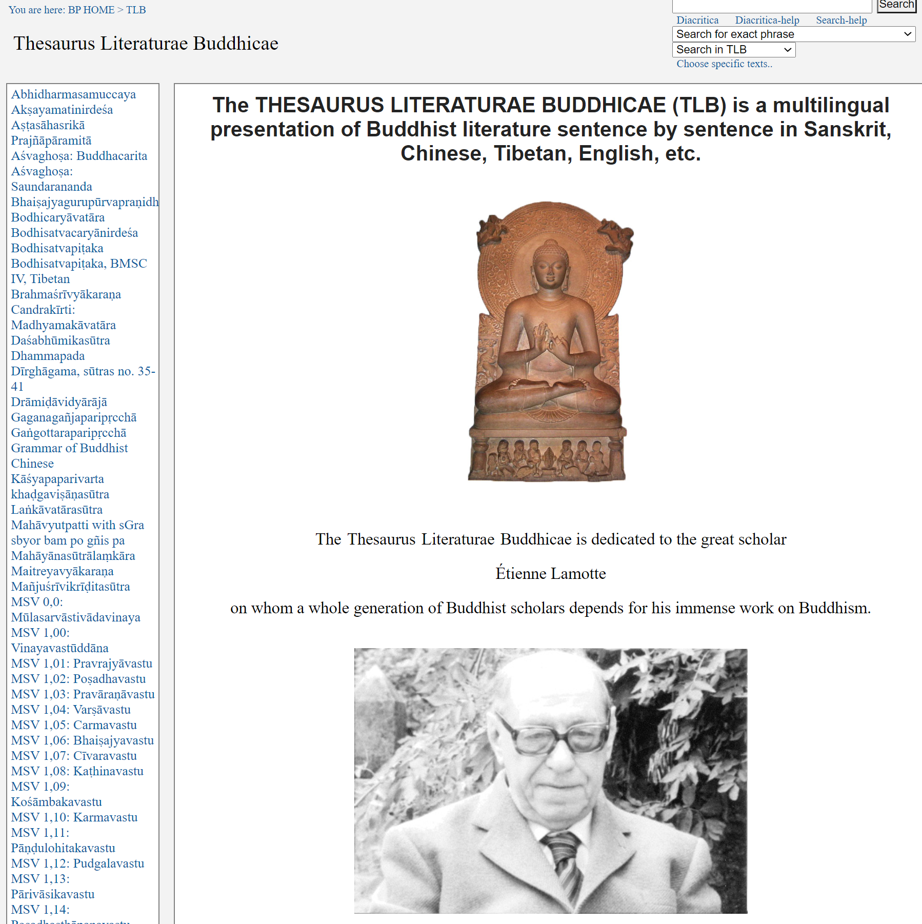 The THESAURUS LITERATURAE BUDDHICAE (TLB) is a multilingual presentation of Buddhist literature sentence by sentence in Sanskrit, Chinese, Tibetan, English, etc.